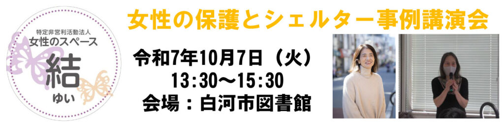 特定非営利活動法人NEXTしらかわでは、女性と子どもの支援に長年取り組む NPO法人 女性のスペース結 をお招きし、講演会を開催します。
